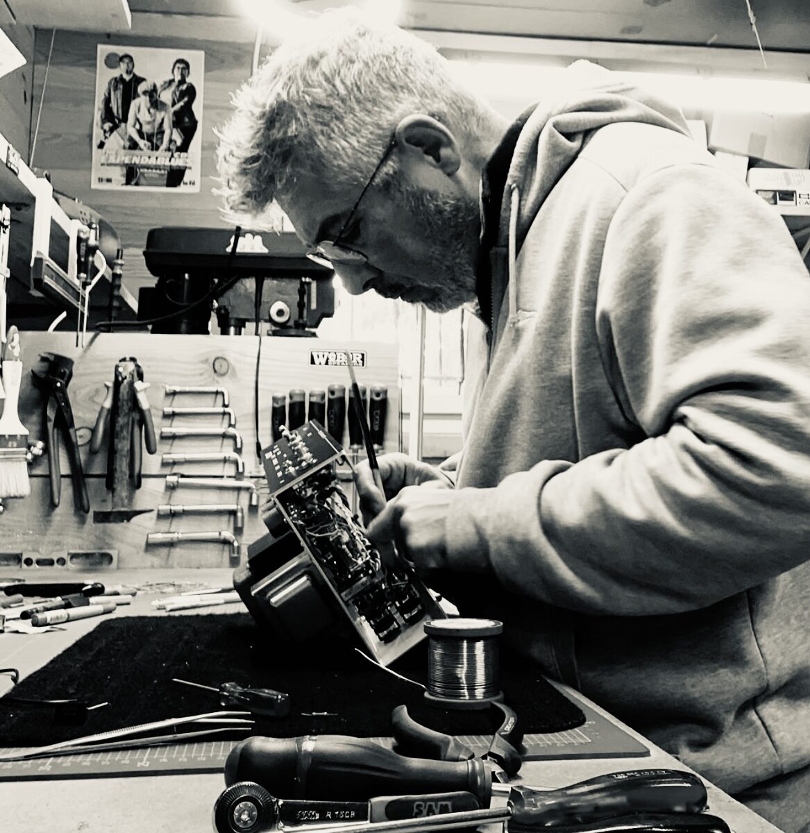 De plus en plus intéressé, il a besoin d’approfondir ses connaissances en amplification à lampes pour guitare ! Il cherche et trouve une école à Lisbonne qui propose ce type de formation et cerise sur le gâteau, les cours sont assurés par un ancien technicien anglais, Tony F. de chez Marshall electronics instruments.